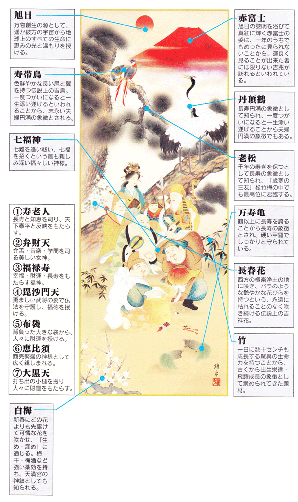 ギフト対応 店長の一言コメント 生命のように燃え上がる旭日を浴び、 鮮やかな真紅に染まる霊峰不二を遥か彼方に望み、長寿の象徴である 老松の元に集う、私たちに最も親しまれて きた七人の福徳の神様・七福神。