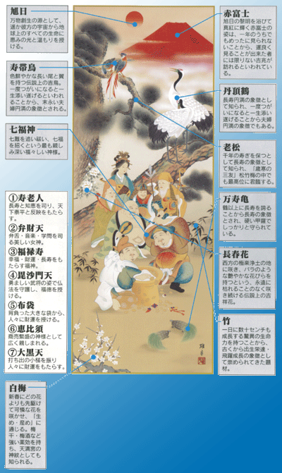 画像をクリックすると大きくなります 新品の掛け軸/掛軸を豊富に取り揃え販売!日本画画壇による名作をお値打ちに!流行に合わせた表装仕上げ! 掛軸のしおり ●初めて・自宅用の掛け軸(掛軸) 水墨山水・彩色山水・四季花・赤富士●新築・落成式用の掛け軸(掛軸) 富士・山水画・四季花・花鳥画●結婚・結納用の掛け軸(掛軸) 高砂・松竹梅鶴亀・夫婦昇鯉●出産・節句用の掛け軸(掛軸) 四季花・四君子・立雛・武者・兜・龍門●開店・開業祝用の掛け軸(掛軸) 七福神・富士・赤富士●節句用の掛け軸(掛軸) 立雛・武者・鐘馗・兜・龍門●お祝い用の掛け軸(掛軸) 山水画・四季花・富士・開運・吉祥●贈答用の掛け軸(掛軸) 山水・四季花・春・夏・秋・冬●長寿祝い用の掛け軸(掛軸) 高砂・松竹梅鶴亀・六瓢息災●お正月用の掛け軸(掛軸) 七福神・旭日・赤富士・吉祥・天照皇大神●お茶席用の掛け軸(掛軸) 書・四季の掛軸●仏事・法要用の掛け軸(掛軸) 名号・十三仏・観音●お彼岸・お盆用の掛け軸(掛軸) 名号・十三仏・観音【掛け軸】吉祥七福満願図(鵜飼 雄平)
